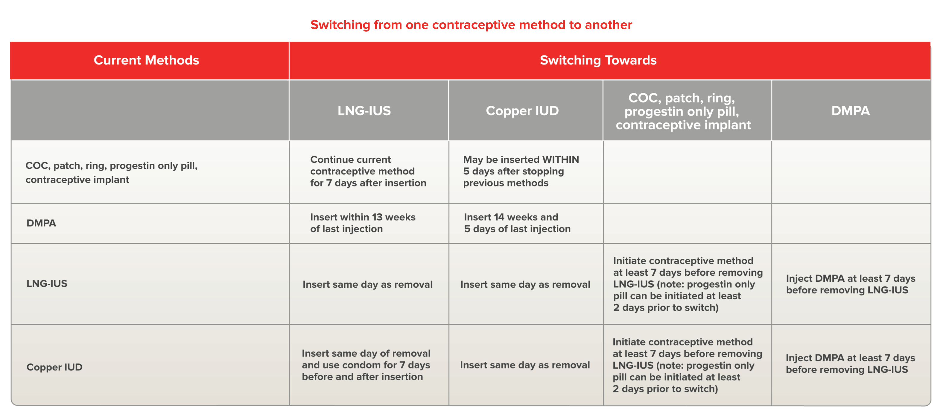 Evidence suggests that IUC can be inserted immediately post-partum including during a caesarean section. Common practice has been waiting until at least 4-6 weeks post-partum, but, for maximum efficacy, IUC should be inserted within 4 weeks post-partum if a woman is not breastfeeding. Therefore earlier placement may be considered in special circumstances.Most product monographs suggest delaying until 6 weeks or involution is complete.