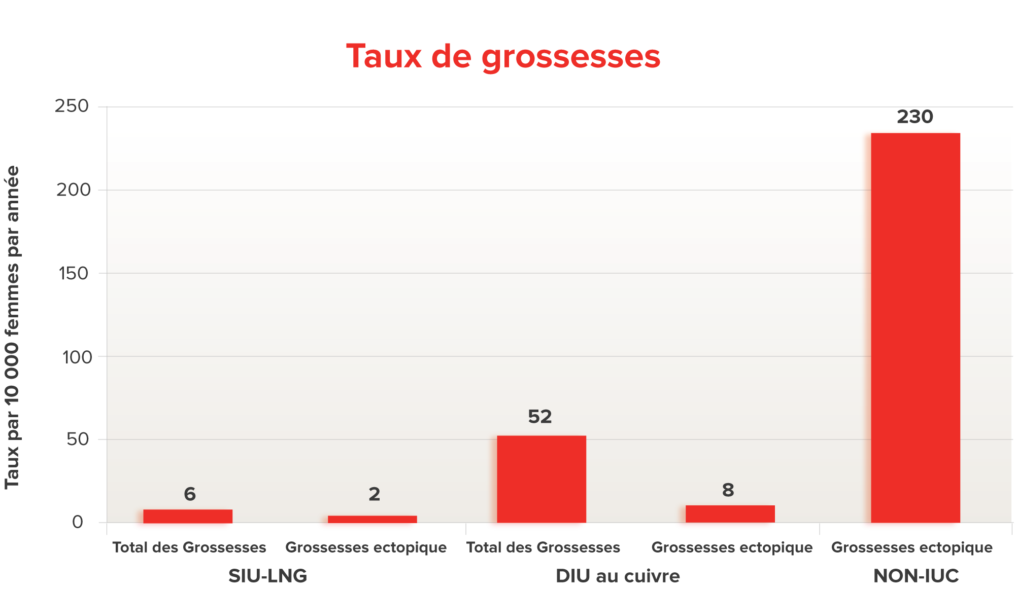 Dans l’étude EURAS, parmi les 118 cas d’échecs contraceptifs (26 SIU-LNG et 92 DIU au cuivre), 21 étaient des grossesses ectopiques (7 SIU-LNG et 14 DIU au cuivre), ce qui correspond à des taux d’incidence de 0,02 pour 100 années-femmes (IC à 95 % : 0,01-0,03) et de 0,08 pour 100 années-femmes (IC à 95 % : 0,04-0,13), respectivement. En comparaison, dans la population générale, entre 2 et 3 % des grossesses sont ectopiques. Les CIU peuvent également être utilisés sans danger chez les femmes ayant déjà eu une grossesse ectopique étant donné que le risque de grossesse diminue.