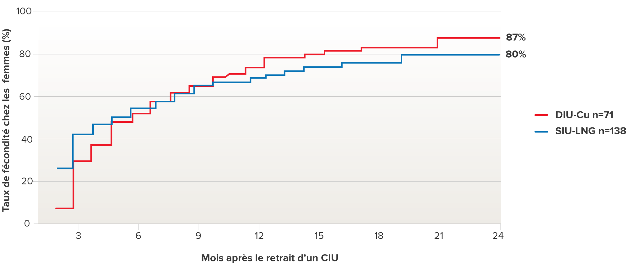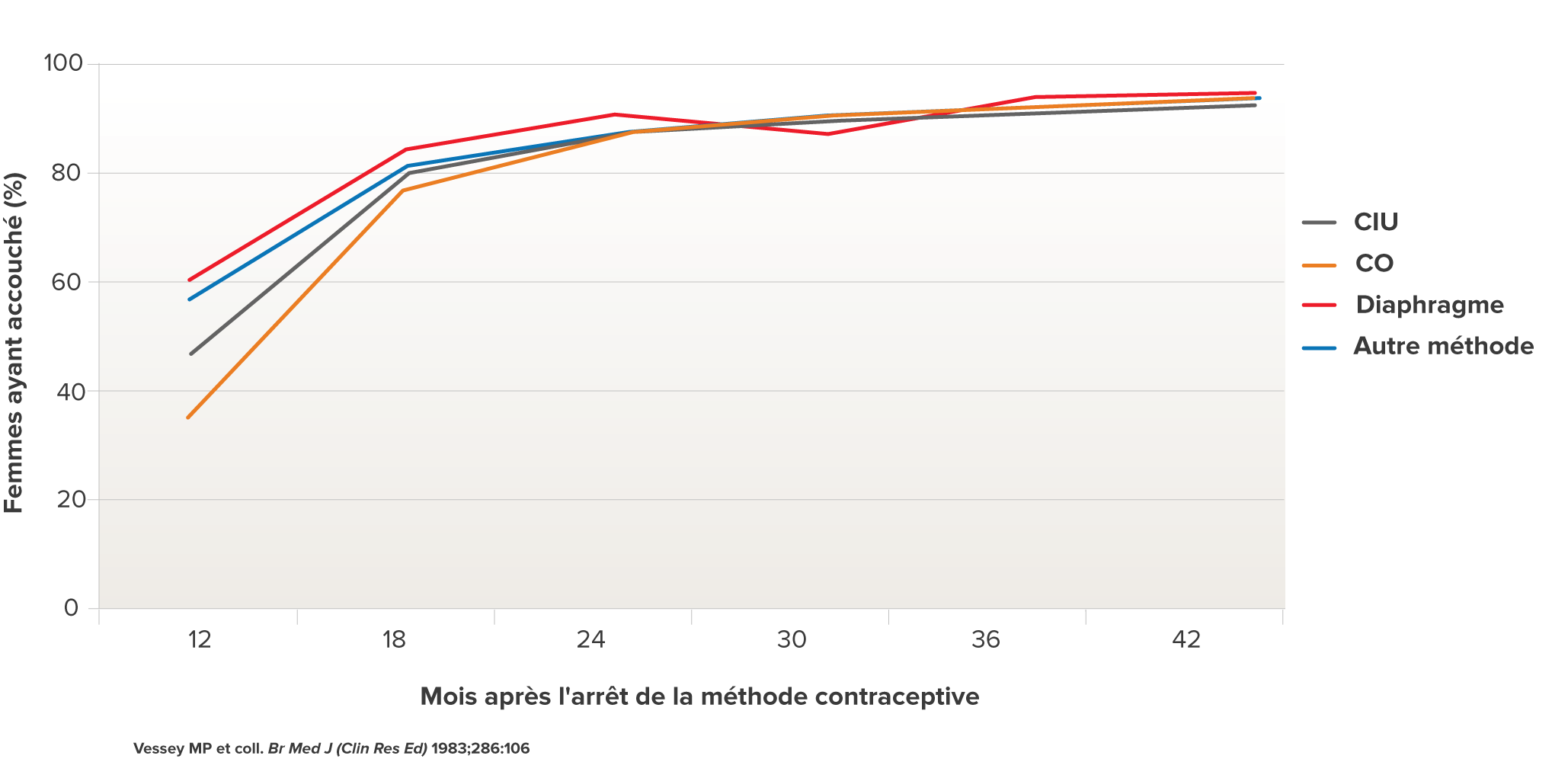 Les femmes qui envisagent fonder une famille dans le futur seront intéressées de connaître dans quelle mesure leur CIU influencera leur fécondité ultérieure. Une étude ayant regardé la fécondité après l’arrêt d’un CIU n’a pas démontré de différences majeures comparativement aux femmes qui cessaient d’autres méthodes de contraception (voir le graphique ci-dessous, Vessey MP. et coll).