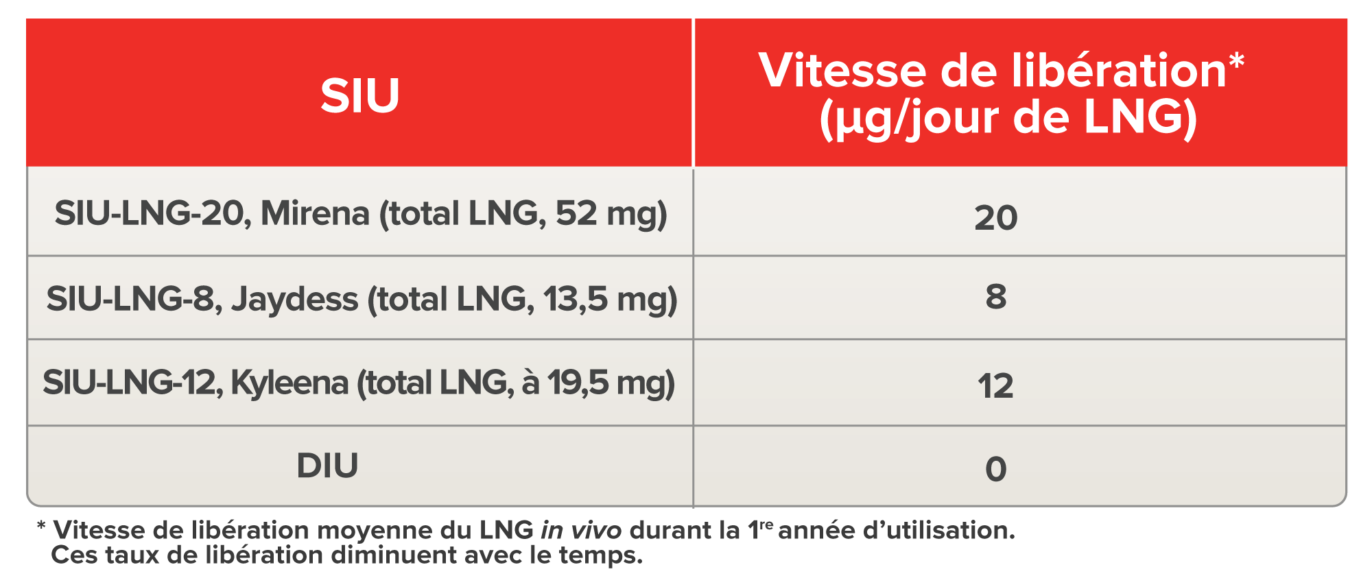 Le SIU-LNG ne renferme pas d’œstrogène et les concentrations sériques de progestatif chez les utilisatrices du SIU-LNG-20 équivalent à environ 0,3 à 4 % des concentrations chez les utilisatrices de contraceptifs oraux contenant du lévonorgestrel. Les DIU au cuivre sont entièrement exempts d’hormones.