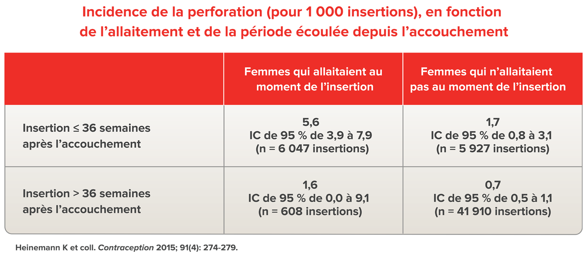 Une perforation partielle (CIU implanté dans la paroi utérine) ou totale de la paroi ou du col de l’utérus peut survenir pendant ou après l’insertion. La vaste majorité des perforations surviennent pendant l’insertion, bien qu’elles puissent ne pas être détectées à ce moment. Par conséquent, il est important de faire une visite de suivi. Un retard dans le diagnostic peut augmenter le risque qu’une perforation partielle devienne une perforation complète (occasion manquée de retirer le CIU au cabinet avant la survenue de complications), qu’une laparoscopie soit nécessaire pour le retrait et, dans de très rares cas, qu’une lésion intra-abdominale se produise. Heureusement, le risque de complication majeure suivant l’insertion d’un CIU, même en cas de perforation, est très faible. Les femmes doivent être informées du faible risque de perforation et de l’importance d’un diagnostic rapide.