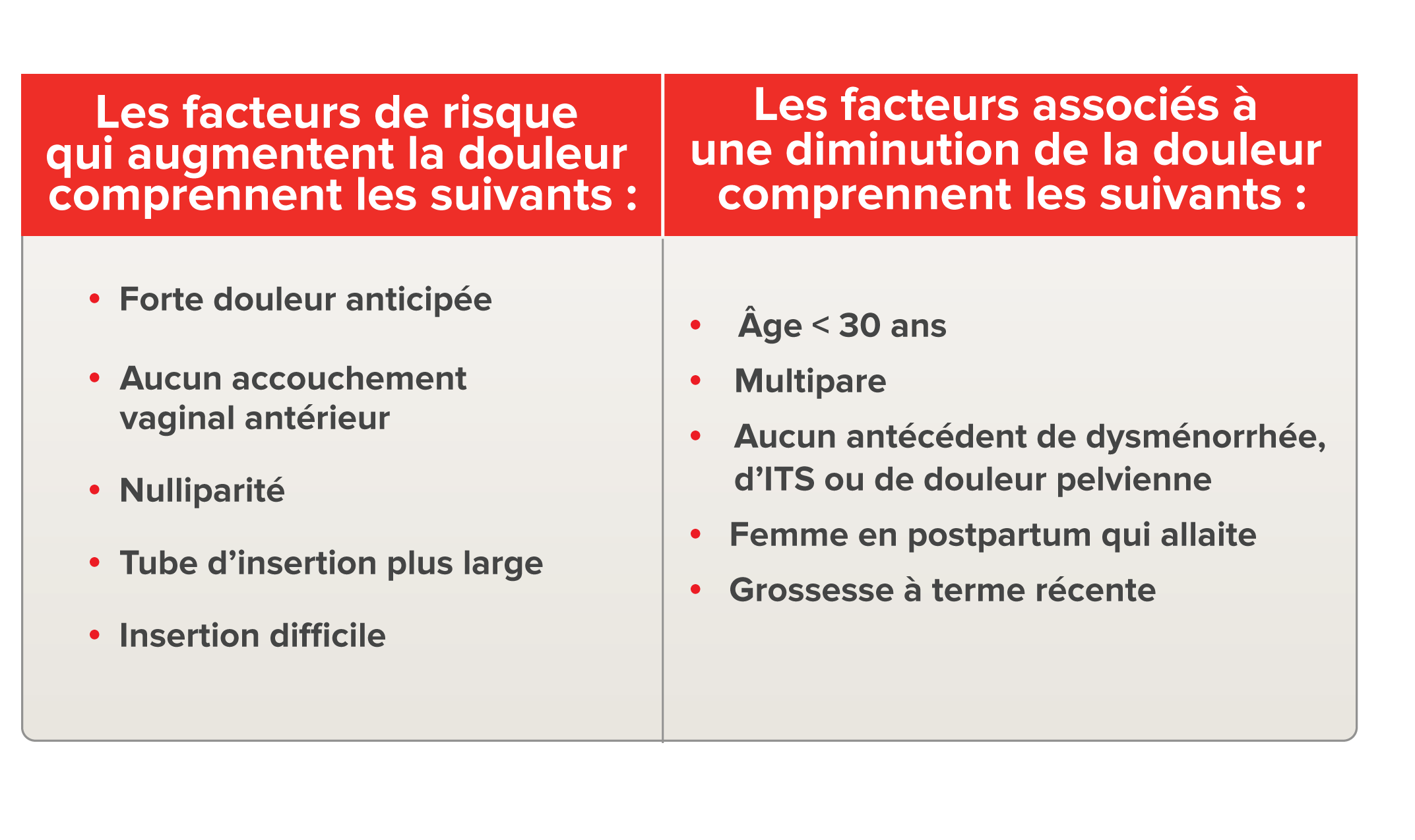En plus d’une bonne technique (rassurer la femme, positionner l’outil lentement, demander à la femme de tousser et éviter d’exercer une pression excessive sur le tenaculum au-delà du premier « clic » du mécanisme), l’application d’un anesthésique local peut diminuer la douleur associée à l’insertion d’un CIU.